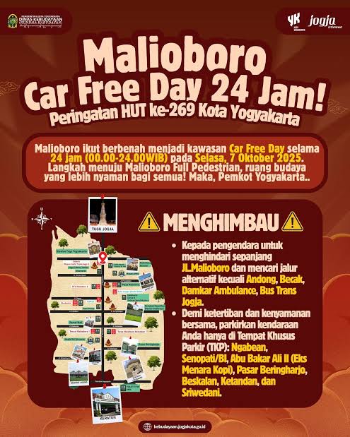 Yogyakarta – Dalam rangka memperingati Hari Ulang Tahun (HUT) ke-269 Kota Yogyakarta, kawasan legendaris Jalan Malioboro berubah total menjadi zona pejalan kaki pada Selasa, 7 Oktober 2025. Tak ada kendaraan bermotor yang diperbolehkan melintas selama 24 jam penuh, mulai pukul 00.00 hingga 24.00 WIB.